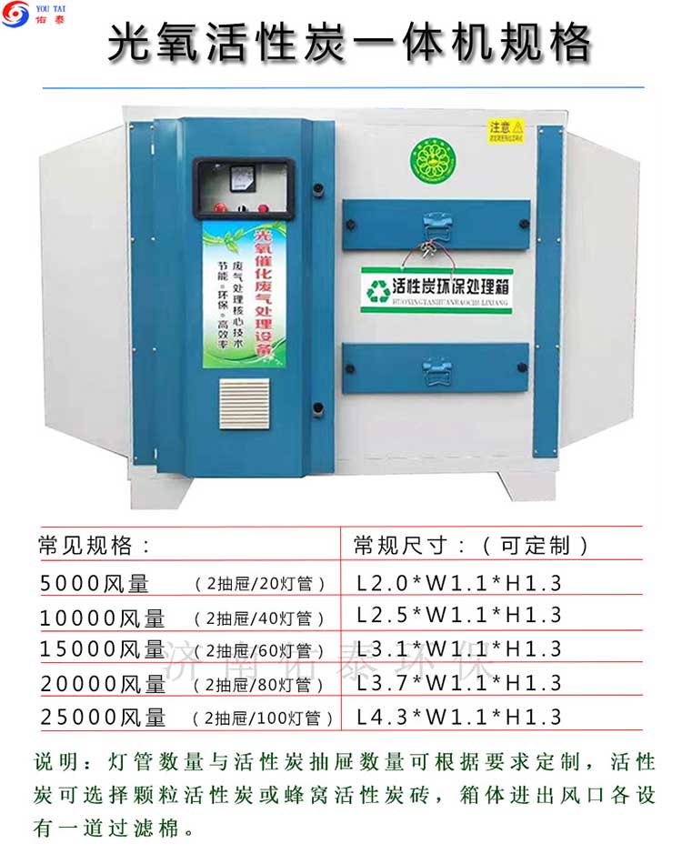 四、佑泰環保光氧活性炭一體機配置如下:(活性炭抽屜數與光氧燈管數可以按要求增減)