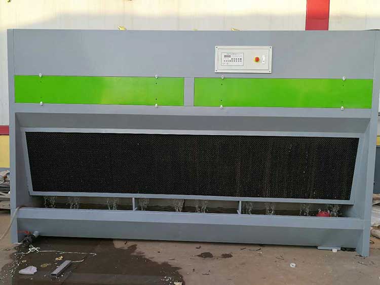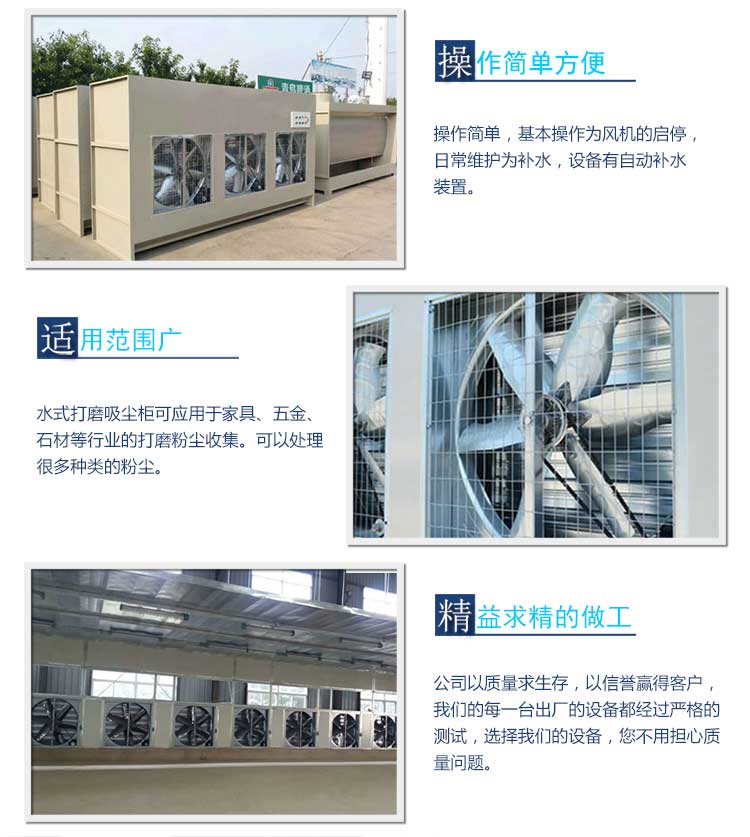 3、工作原理:產品打磨產生的粉塵,經過風機,吸附到打磨柜里面,通過里面的水循環,落到打磨柜的下面。