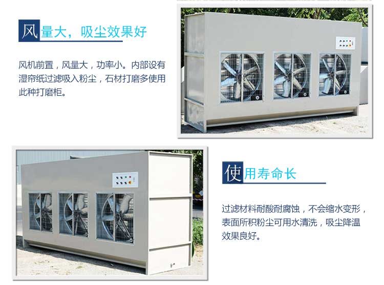 一、水式打磨吸塵柜有多種樣式,可根據工廠實際情況選擇相應款式,水式除塵柜比干式除塵柜的優點是相同功率下,水式的除塵效率要高一些。