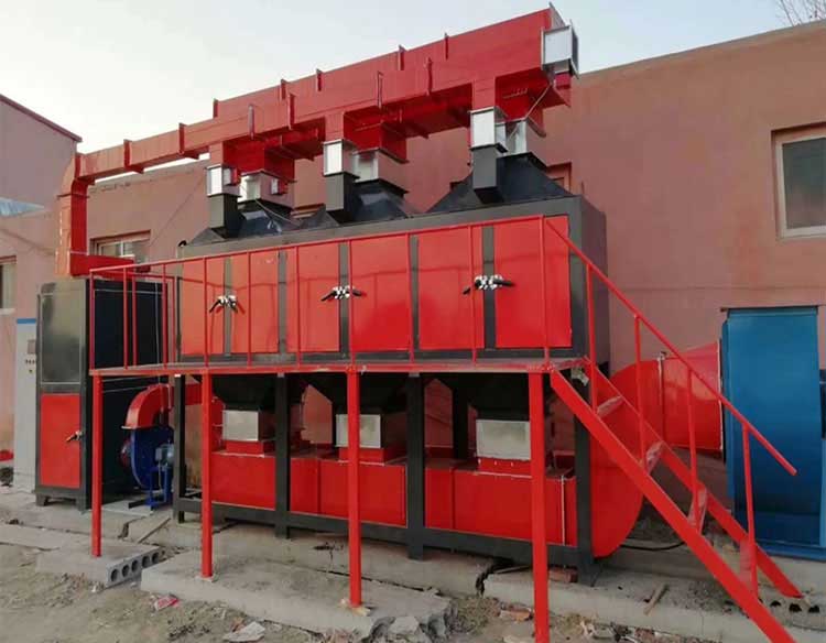 吸附時,廢氣在引風機的作用下,截留的低溫低濃度廢氣進入凈化裝置進行吸收,廢氣被蜂窩活性炭吸附凈化,凈化后的空氣由風機通過排氣管排出。