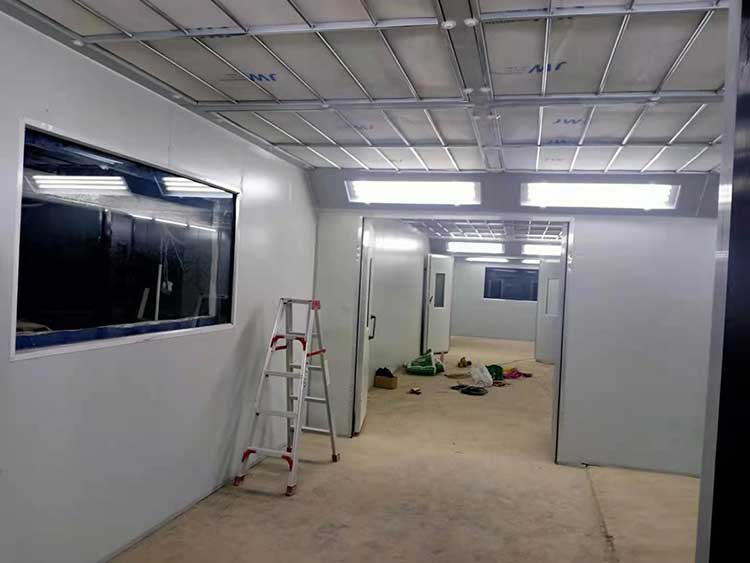 整個室體結構采用40×40(MM),管壁厚1(MM)方管焊接制成鋼架結構聯成一體,并經過防銹處理;墻板采用彩鋼夾芯板,整體為拼裝結構,周遍使用U形槽插口對設備室體加固,所有墻板接縫均勻涂抹密封膠;噴漆室包角為鍍鋅板整體折彎成型,包角板與室體骨架與墻板用拉鉚釘固定,拉鉚釘間距誤差不大于5mm,確保外觀整齊。